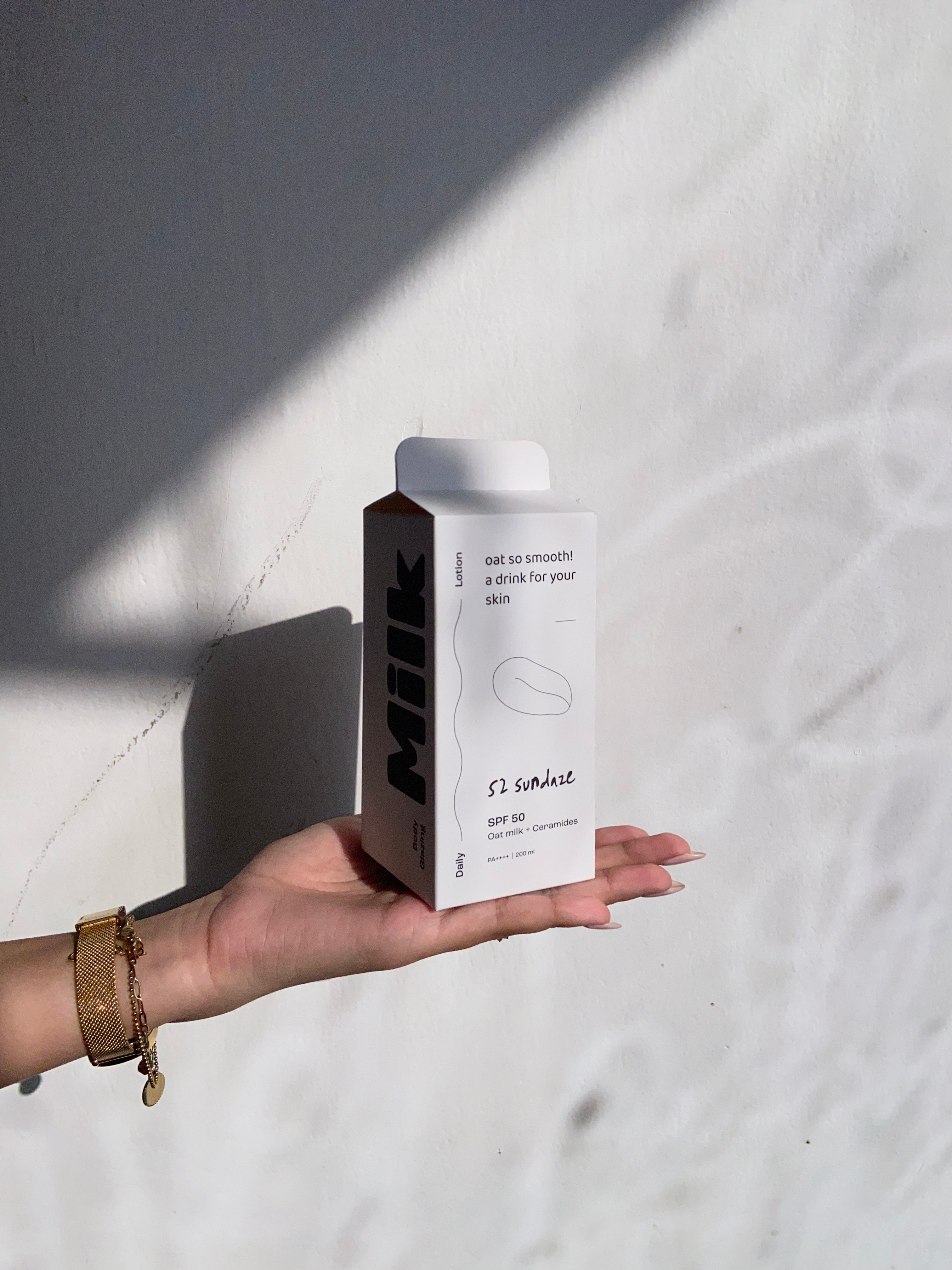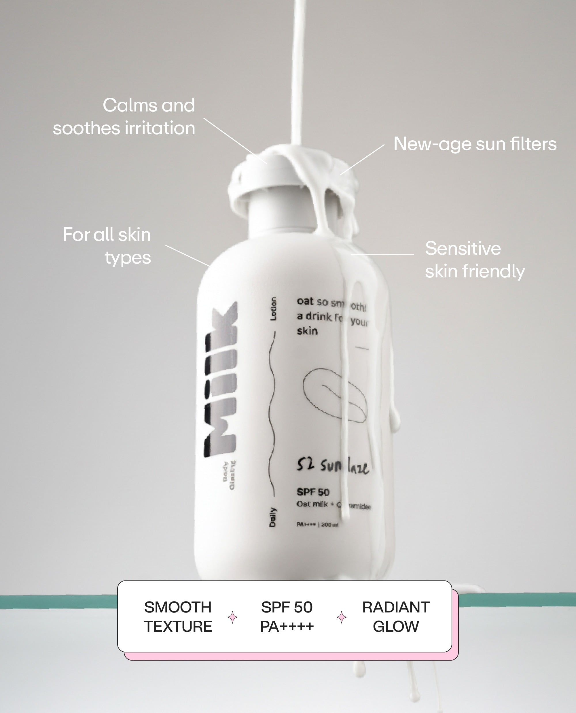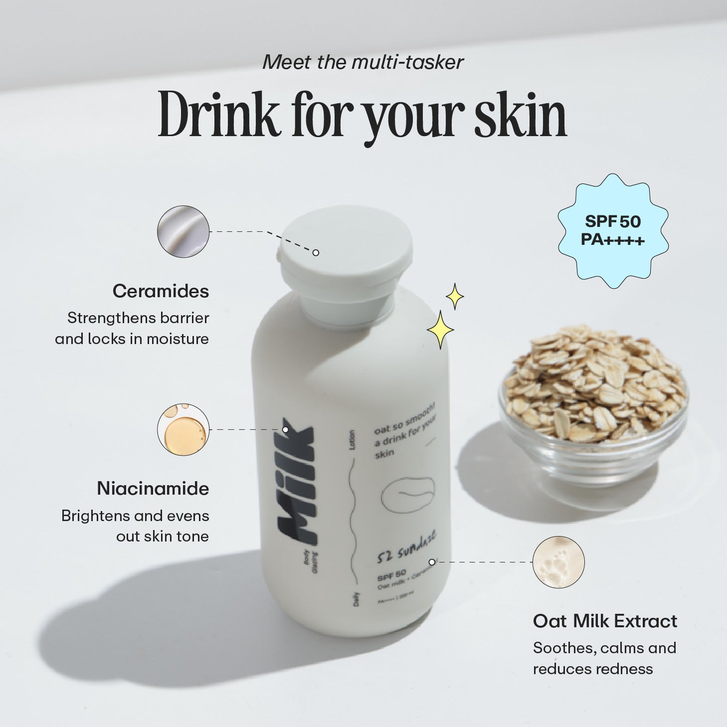 This lightweight, milky lotion is packed with oat milk extract, ceramides & niacinamide to deeply hydrate, soothe redness, and fade tan – while SPF 50 protects you from the sun. Leaves your skin glazed, plump, and happy all day.